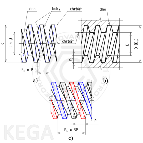 a) - vonkajší jednodochodý závit, b) - vnútorný závit, c) - vonkajší trojchodý závit