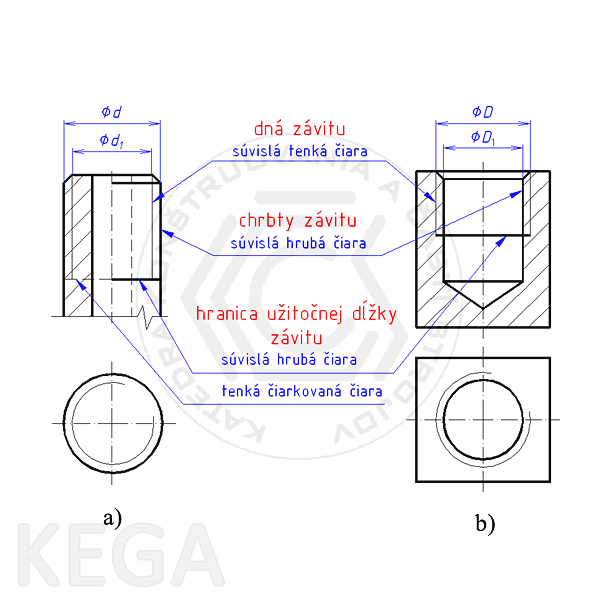 Obr. 10.9 - Zobrazovanie chrbtov, dien závitov a hraníc užitočnej dĺžky vonkajšieho závitu (a), vnútorného závitu (b)