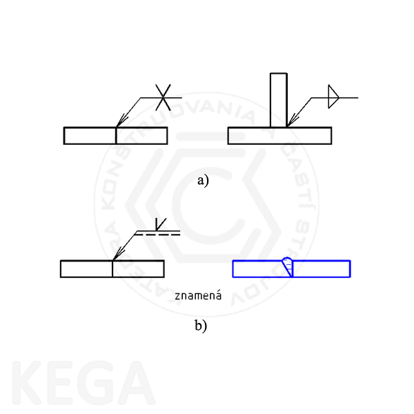 Obr. 12.13 - Kreslenie a umiestnenie odkazovej čiary: a)-pri symetrických zvaroch, b)-pri polovičných zvaroch